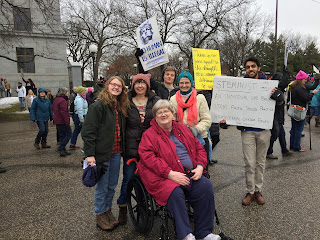 Whenever 100,000 human beings come together in the spirit of justice and with hearts centered in love, it transcends beyond simply political. It was a spiritual experience. Here we were, packed together like sardines, and one would expect crankiness, especially after standing in place for an hour. But rather there was laughter, sharing, planning for the future, and a firm commitment to action understanding this was but the beginning. The crowd began to move, and I had no clue where I was and others had said the same, but we moved, this mass of humanity and yet space was made for my wheelchair (and another we encountered along the way. Old and young, disabled and able bodied, a truly eclectic crowd moving towards our goal. Then we rounded a turn and ahead was the capitol and the view was breathtaking. Later some news media wanted to portray the size of the crowd by comparing it to the RNC protests. But see, I attended those protests and they were no where near the size of this one.